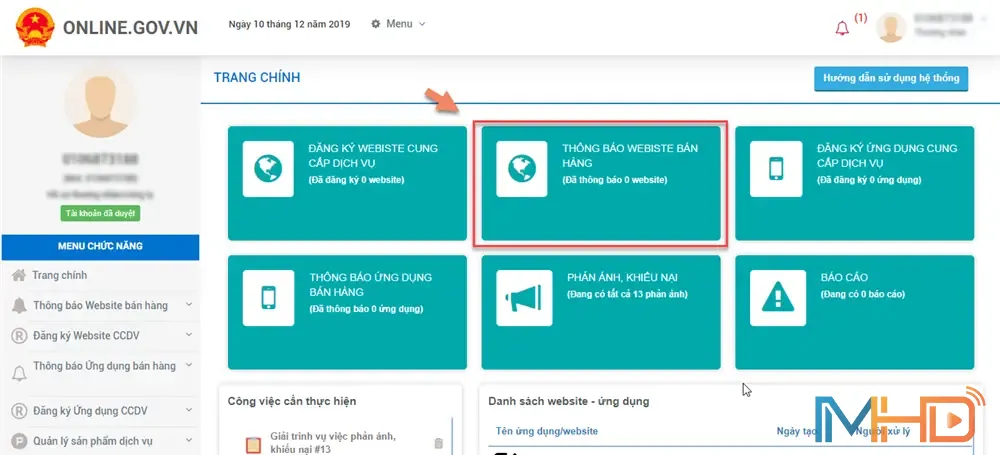 Cách 2: Tại mục LIÊN KẾT NHANH trên trang > chọn biểu tượng “Thông báo website bán hàng”