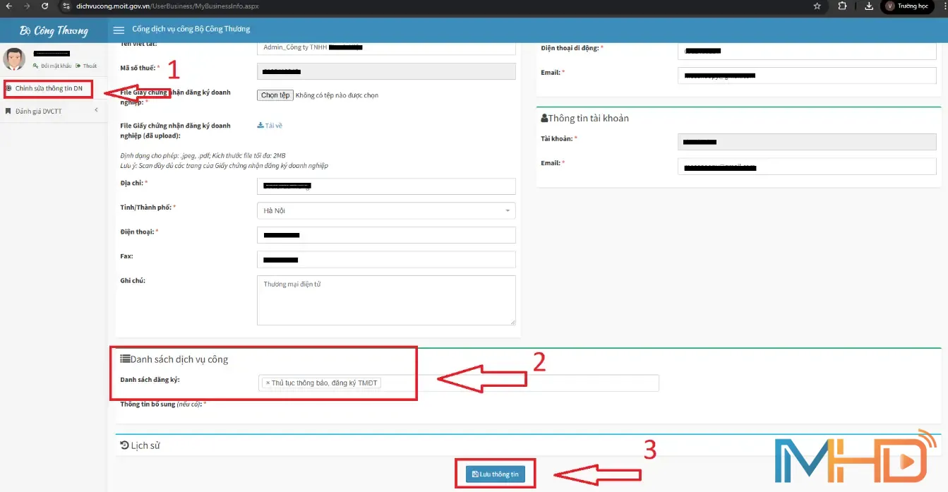 Sau khi đăng nhập, vào phần “Chỉnh sửa thông tin DN” để đăng ký danh mục dịch vụ công cần thao tác. Tại đây, chọn “Danh sách dịch vụ Công”. Tại “Danh sách đăng ký” > chọn “Thủ tục thông báo, đăng ký TMĐT” > Lưu thông tin