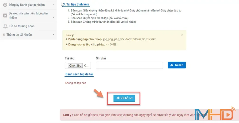 Khi quý vị đã nhập đủ thông tin và đính kèm đầy đủ tài liệu theo yêu cầu, bước tiếp theo là nộp hồ sơ trên hệ thống. Quý vị bấm chọn “Gửi hồ sơ” để hoàn thiện việc khai báo.